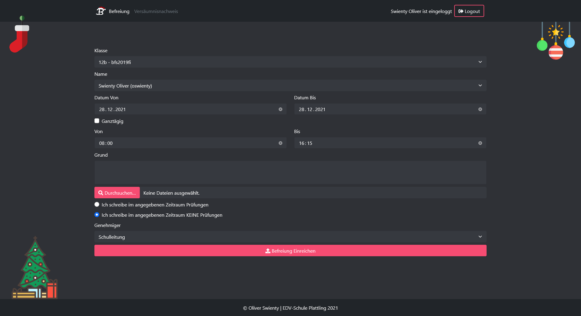 Digitale Lösung für die Einreichung von Befreiungen und Versäumnisnachweisen an der EDV-Schule Plattling. Die Anwendung ersetzte die vorherige papierbasierte Zettelwirtschaft und ermöglichte Schülern, ihre Anträge online einzureichen und verwalten zu lassen.